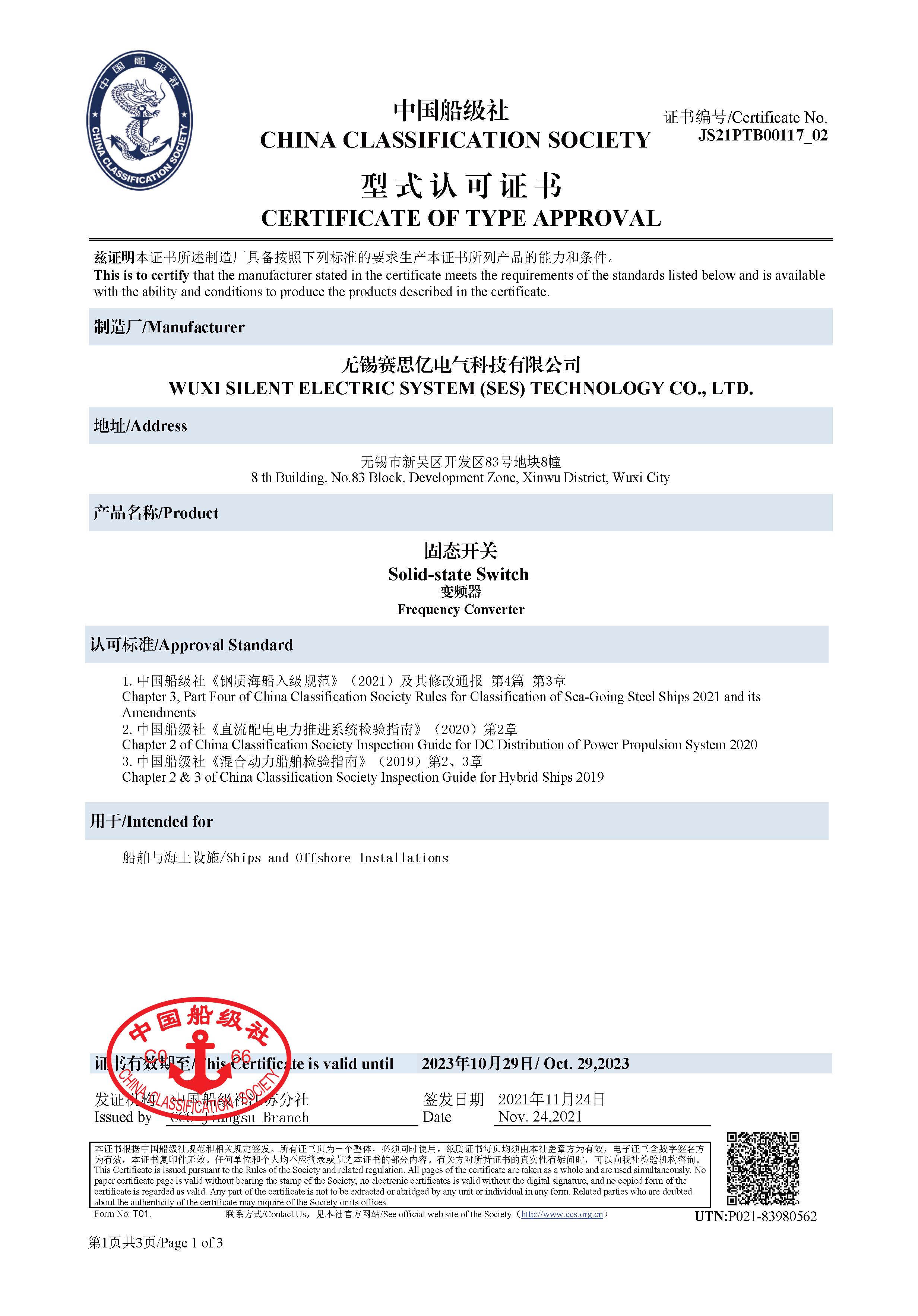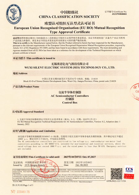 交流半導(dǎo)體控制器歐盟認(rèn)可組織互認(rèn)型式認(rèn)可證書(CCS)
