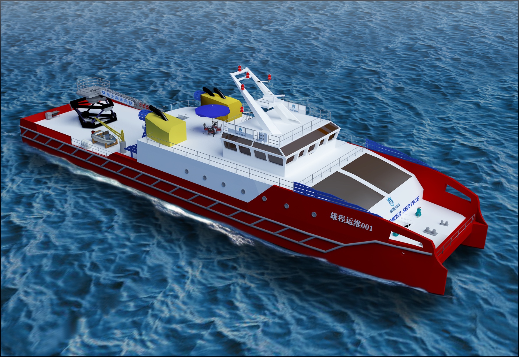 此艘50M風(fēng)電運維船設(shè)計為雙體船總長49.9米,排水量約600噸,將是目前國內(nèi)先進(jìn)的創(chuàng)新型風(fēng)電運維船,雙舵槳主推,雙艏側(cè)推,配備六自由度波浪補償?shù)浅讼到y(tǒng)、直流組網(wǎng)電力推進(jìn)系統(tǒng)和DP-2動力定位系統(tǒng),擁有能在4級風(fēng)海況下進(jìn)行登乘作業(yè)的能力,穩(wěn)性滿足抗8級風(fēng)的能力,核心設(shè)備實現(xiàn)國產(chǎn)化。