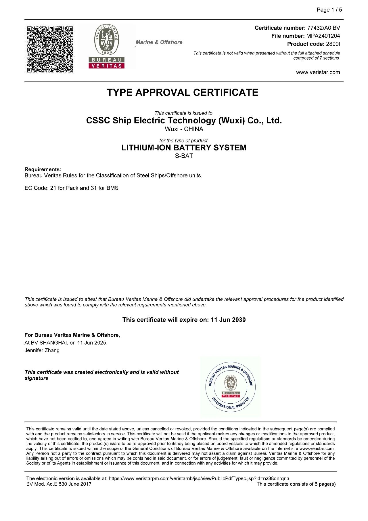 2025年6月11日,中船賽思億(無錫)電氣科技有限公司(CSSC Ship Electric Technology ( Wuxi) Co.,Ltd.)磷酸鐵鋰電池系統(tǒng)順利取得法國船級社 (BV) 型式認(rèn)可證書,是中船賽思億進(jìn)軍國際船舶建造項(xiàng)目的一塊強(qiáng)有力的“敲門磚”。截至目前,中船賽思億憑借強(qiáng)大的技術(shù)攻堅(jiān)能力,已實(shí)現(xiàn)自產(chǎn)電池包(模組兼容寧德時(shí)代、億緯鋰能等品牌)及BMS電池管理系統(tǒng)全系列產(chǎn)品的全覆蓋,且均已順利取得中國船級社(CCS)、法國船級社(BV)兩大主流船級社型式認(rèn)可證書,對中船賽思億深耕海內(nèi)外綠色船舶市場開拓具有重要意義。